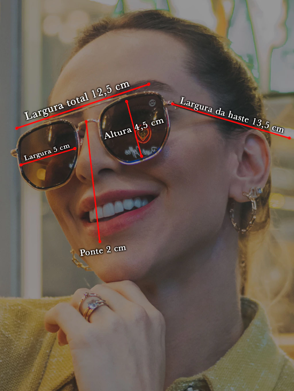 - Dimensões: Largura 13,5 cm | Altura 4,5 cm | Largura lente 5 cm | Haste 13,5 cm | Ponte 2 cm